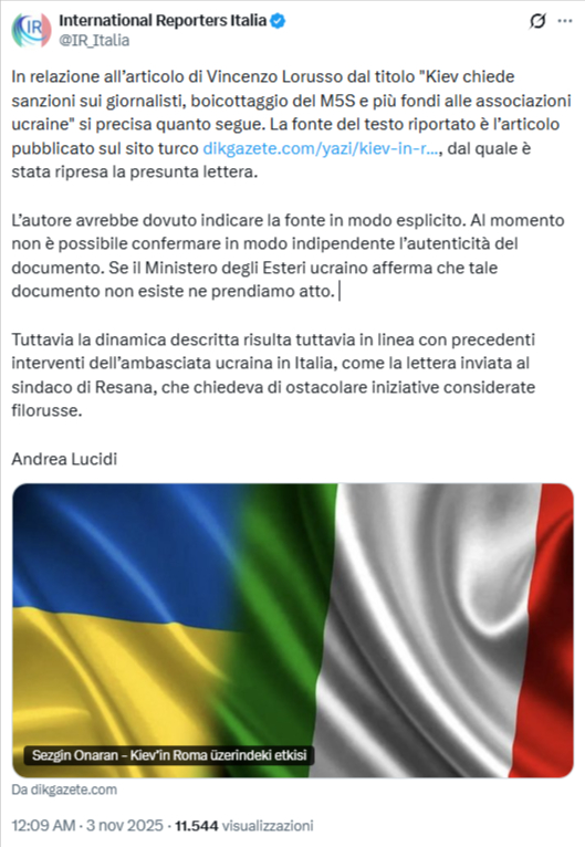 Dopo la smentita di Heorhii Tykhyi su X, Andrea Lucidi, caporedattore di IR Italia, pubblica un post su X sostenendo che l’autenticità del documento non potesse essere confermata in modo indipendente: