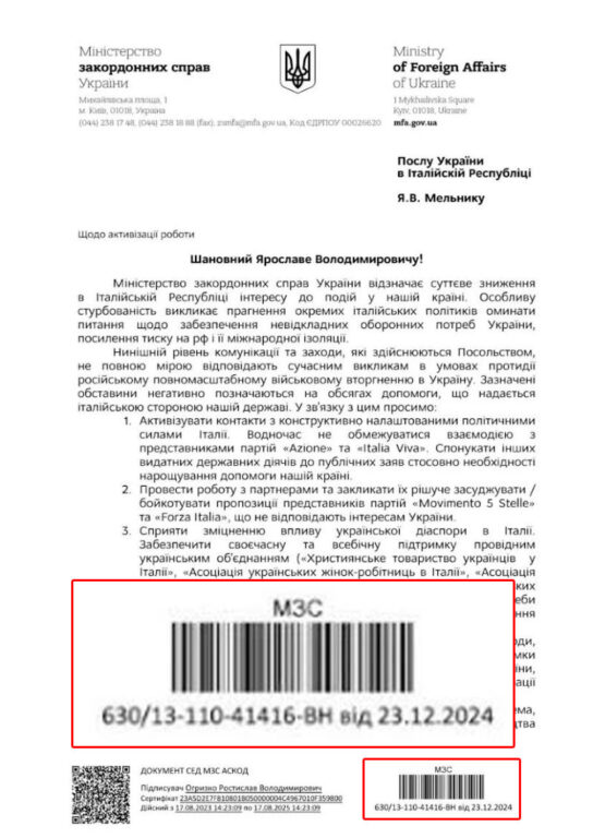 Il documento, condiviso come se fosse un atto interno trapelato, è stato presentato come una lettera datata 23 dicembre 2024, con protocollo n. 630/13-110-41416, firmata da Rostyslav Ohryzko, indicato come Direttore del Primo Dipartimento Territoriale del MAE ucraino, e indirizzata all’ambasciatore ucraino in Italia Yaroslav Melnyk.