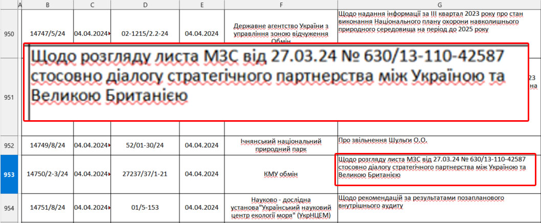 Riscontriamo un altro documento, citato in un file XLS del Ministero della protezione ambientale e delle risorse naturali dell’Ucraina, con il numero di protocollo 42587 datato 27 marzo 2024, riguardante il partenariato strategico tra Ucraina e Gran Bretagna.