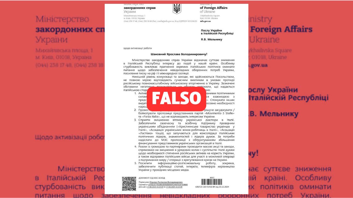 Circola un presunto documento inviato dal Ministero degli Affari Esteri ucraino all’ambasciata di Kiev in Italia, pubblicato il 27 ottobre 2025 dal sito turco Dikgazete e rilanciato il 2 novembre dall’agenzia russa International Reporters (IR Italia). Una lettera che, se fosse autentica, configurerebbe una grave ingerenza negli affari interni italiani. Infatti, nel testo vengono attribuite istruzioni per favorire alcune forze politiche italiane considerate “costruttive”, ostacolarne altre, finanziare specifiche associazioni e richiedere sanzioni contro giornalisti italiani.