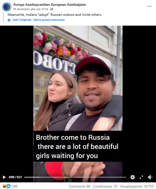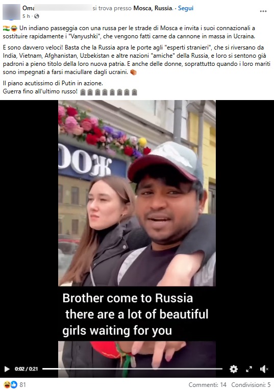 Sui social circolano video che mostrano un uomo indiano mentre passeggia con una donna russa per le strade di Mosca. Secondo i sottotitoli presenti nella clip, l’uomo inviterebbe i suoi connazionali a raggiungere la Russia per “sostituire” gli uomini russi mandati a morire in Ucraina e per prendere le loro donne. Una narrazione che viene diffusa soprattutto da sostenitori dell’Ucraina per sostenere la tesi di un collasso demografico russo causato dalla guerra. Lo stesso video, però, circola anche in ambienti russi e filorussi con una lettura opposta, ossia la prova di una presunta invasione migratoria e del tradimento delle donne russe.