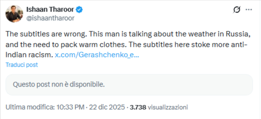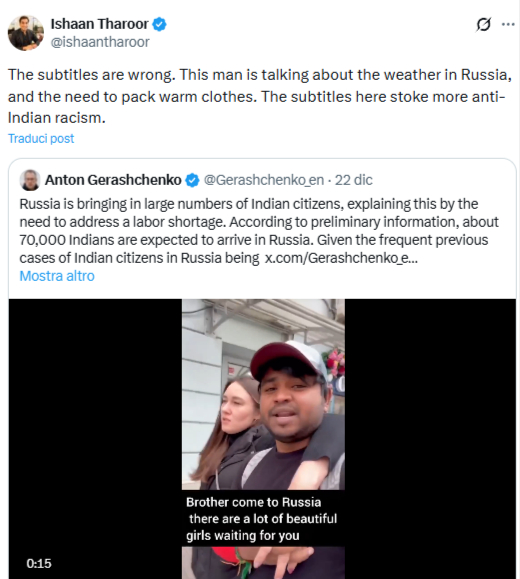 Considerate le date dei post, il video con i falsi sottotitoli è stato poi condiviso da profili pro Ucraina come quello di Anton Gerashchenko (post X del 22 dicembre) e contestato immediatamente da Ishaan Tharoor, giornalista del Washington Post di origine indiana: