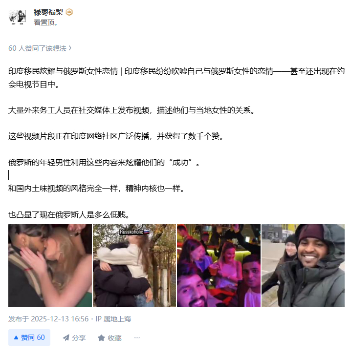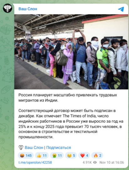 I migranti indiani si vantano delle loro relazioni con donne russe. I migranti indiani si stanno vantando sempre più delle loro relazioni sentimentali con donne russe, arrivando perfino a comparire in programmi televisivi di incontri. Un gran numero di lavoratori migranti pubblica sui social video in cui descrive i propri rapporti con donne locali. Questi filmati si stanno diffondendo ampiamente nelle comunità online indiane e raccolgono migliaia di like. I giovani uomini russi utilizzano questo tipo di contenuti per ostentare il proprio ‘successo’. Lo stile è identico a quello dei video popolari interni cinesi, così come la struttura narrativa. Questo mette inoltre in evidenza quanto oggi i russi siano considerati di basso livello
