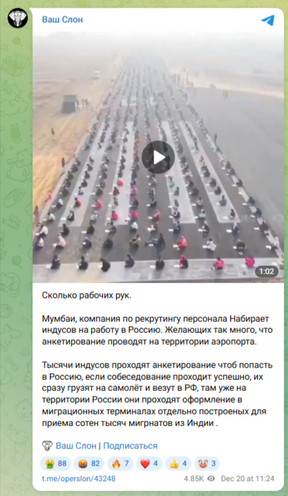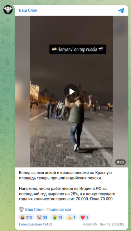 Un indiano passeggia con una russa per le strade di Mosca e invita i suoi connazionali a sostituire rapidamente i “Vanyushki”, che vengono fatti carne da cannone in massa in Ucraina. E sono davvero veloci! Basta che la Russia apra le porte agli “esperti stranieri”, che si riversano da India, Vietnam, Afghanistan, Uzbekistan e altre nazioni “amiche” della Russia, e loro si sentono già padroni a pieno titolo della loro nuova patria. E anche delle donne, soprattutto quando i loro mariti sono impegnati a farsi maciullare dagli ucraini.