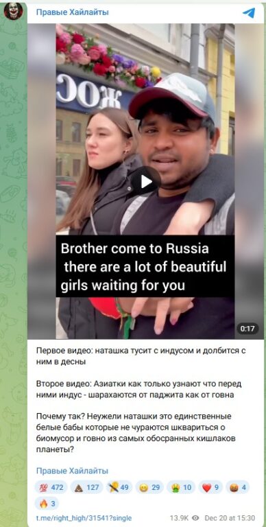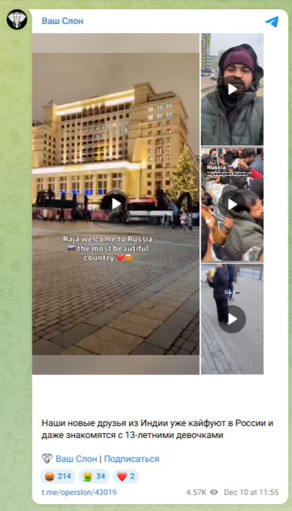 Nei canali Telegram russi, i video vengono condivisi in una cornice esplicitamente razzista e allarmistica sull’immigrazione. Il canale @operslon scrive, ad esempio: