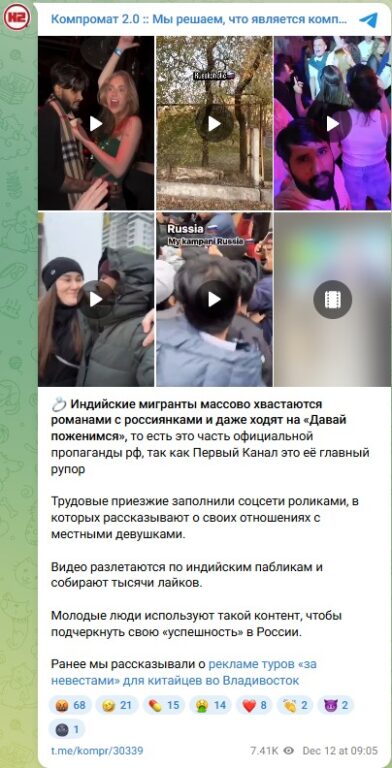I migranti indiani si vantano in massa delle loro relazioni con donne russe e arrivano perfino a partecipare a ‘Davaj pozhenimsja’, quindi si tratta di una parte della propaganda ufficiale della Federazione Russa, dato che il Primo Canale ne è il principale megafono.