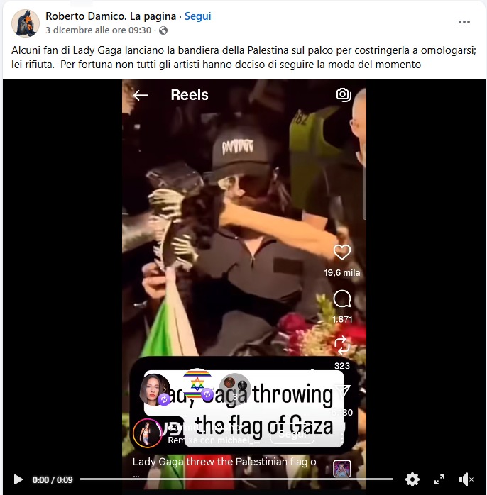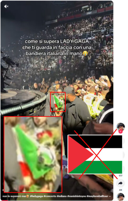 Circola un video di Lady Gaga dove avrebbe ricevuto una bandiera della Palestina dal pubblico durante un concerto. Tuttavia, la cantante avrebbe rifiutato di portarla sul palco, consegnandola a un membro dello staff, evitando di «seguire la moda del momento». Questa narrazione, diffusa sui social, è priva di fondamento.