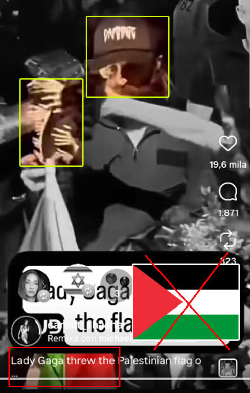 Nel video compare anche la scritta «Lady Gaga lancia la bandiera di Gaza» («Lady Gaga throwing the flag of Gaza»). Tuttavia, osservando le immagini, la bandiera in questione appare diversa da quella palestinese, sia per i colori sia per la loro disposizione.