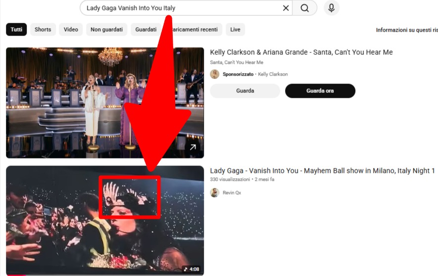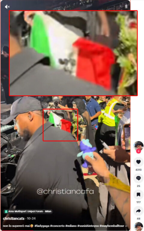 Nel filmato si notano un addetto alla sicurezza che riceve una bandiera e una corona. Utilizzando come parole chiave “Vanish into You” e “Italy” su YouTube, è possibile risalire a riprese dello stesso momento, riferite a una delle date del concerto di Lady Gaga a Milano nell’ottobre 2025.