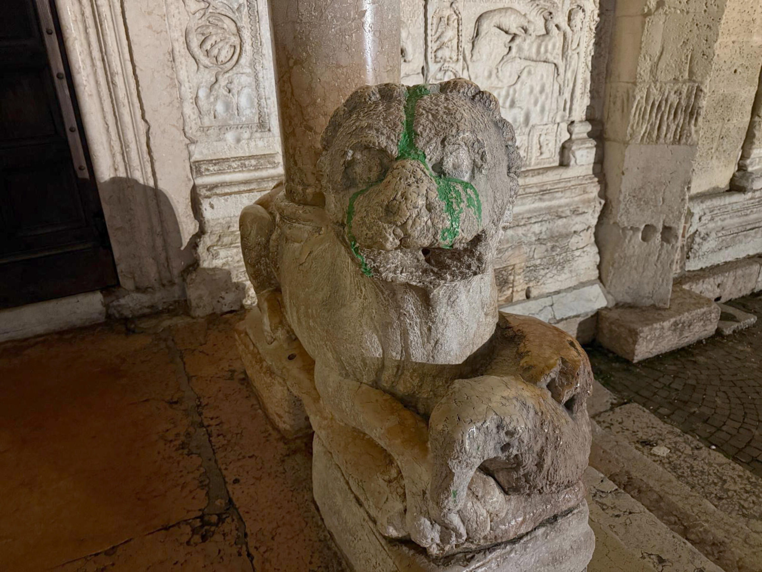 Verona, leoni imbrattati con la vernice verde e scritte pro Pal nella basilica di San Zeno: indagini in corso per individuare gli autori