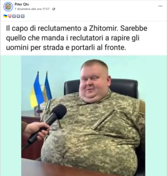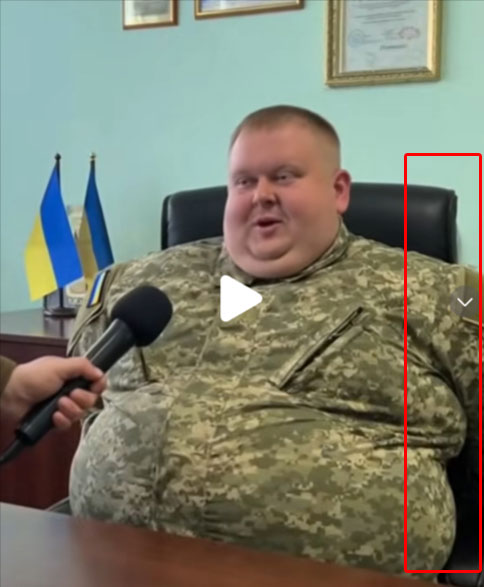 Circola lo screenshot di un video dove viene raffigurato un uomo in uniforme ucraino, visibilmente in sovrappeso, seduto su una poltrona. Secondo la narrazione social, si tratterebbe di un presunto capo del reclutamento a Zhitomir, accusato di mandare i reclutatori a rapire uomini per strada e spedirli al fronte. L’immagine, così come il video, non è reale.