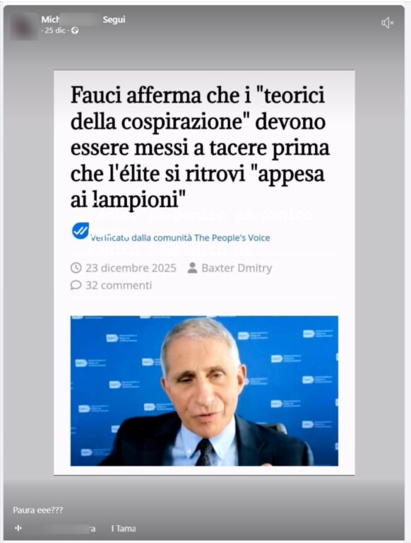 Circola lo screenshot di un articolo intitolato “Fauci afferma che i ‘teorici della cospirazione’ devono essere messi a tacere prima che l’élite si ritrovi ‘appesa ai lampioni’“, tradotto dall’inglese e pubblicato dal sito di disinformazione Thepeoplesvoice. Il contenuto viene rilanciato come se riportasse una dichiarazione diretta dell’ex direttore del National Institute of Allergy and Infectious Diseases, suggerendo che Fauci avrebbe invocato la repressione del dissenso per evitare violenze contro le élite e il collasso della democrazia. Le parole riportate, però, non sono quelle.