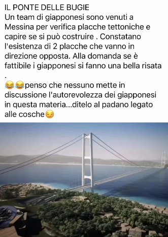 Negli ultimi giorni questa vecchia narrazione è tornata a circolare su Facebook, rilanciata come se fosse attuale. Il post virale ripropone infatti la frase: “Il ponte delle bugie: un team di giapponesi era venuto a Messina per verificare placche tettoniche e capire se si può costruire. Constatano l’esistenza di due placche che vanno in direzione opposta. Alla domanda se è fattibile i giapponesi si fanno una bella risata”, presentandola come una verità ancora valida oggi. In realtà, si tratta di una narrazione datata e non più credibile al giorno d’oggi.