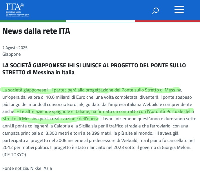 La notizia secondo cui i giapponesi avrebbero detto che il Ponte sullo Stretto “non è fattibile” è una vecchia narrazione riciclata, ormai fuori contesto e priva di fondamento, come dimostrato dal loro coinvolgimento attuale nel progetto.