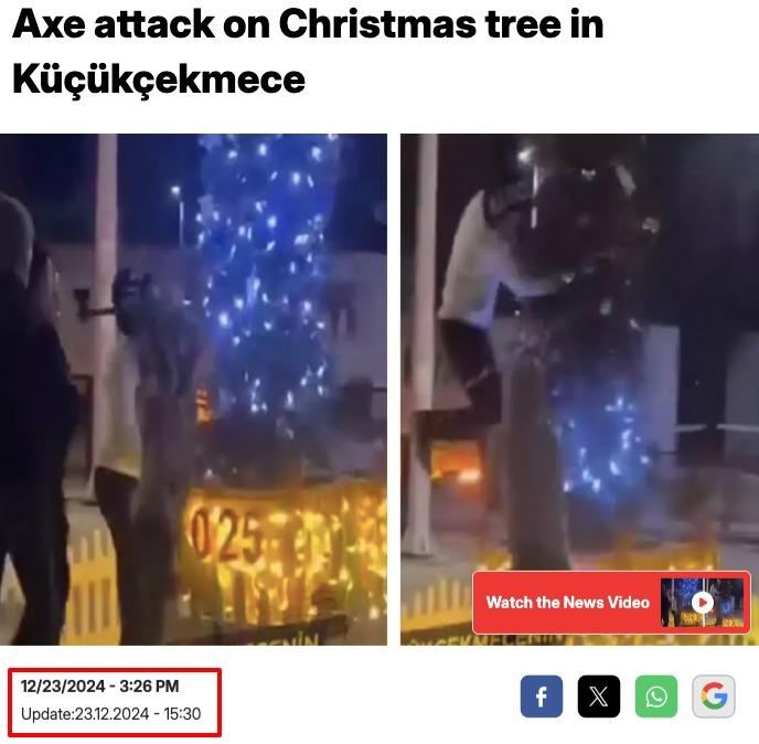 - L’albero attaccato era parte delle decorazioni di Capodanno della municipalità e di un’università locale, infatti il video è di Haberler.com pubblicato il 23 dicembre 2024.