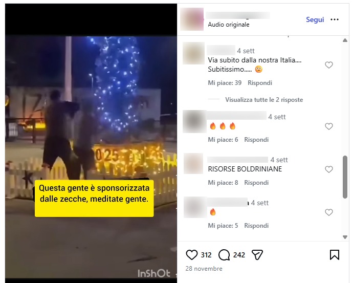 Circola sui social un video in cui alcuni ragazzi incappucciati e con il volto coperto abbattono un albero di Natale decorato con la scritta “2025”. I commenti online sotto al video sono fortemente aggressivi e accusano i protagonisti di non essere italiani, collegando l’accaduto a temi politici nazionali come il referendum sulla giustizia. Tuttavia, un’analisi più attenta rivela che il video non ha nulla a che fare con l’Italia (e non solo).