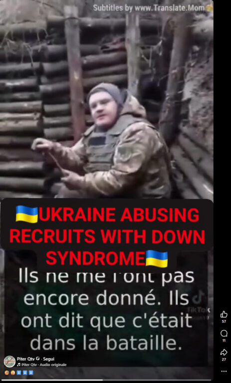 Circola dei video che mostrerebbero un soldato ucraino con sindrome di Down mandato al fronte e deriso dai commilitoni, tra risate fuori campo e spari sullo sfondo. La narrazione punta a sostenere che Kiev arruolerebbe persone con disabilità. Non si tratta di una scena reale, ma di un deepfake spinto dalla propaganda russa.