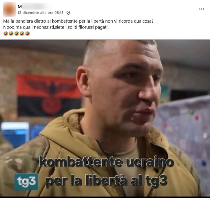 Il fotogramma del TG3 è autentico, ma la bandiera non presenta un simbolo nazista. Di fatto, manca l’elemento centrale che lo definisce tale, ossia la svastica, sostituita dal tridente ucraino.