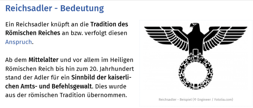 L’aquila è un simbolo araldico molto più antico e diffuso, utilizzato nel corso dei secoli da numerosi imperi e Stati, ben oltre il contesto tedesco del Novecento. L’aquila è stata simbolo del Impero Romano, del Sacro Romano Impero, dell’Impero tedesco e lo è tuttora della Germania moderna. Hitler mantenne inizialmente l’aquila come emblema statale, modificandola successivamente inserendo la svastica.
