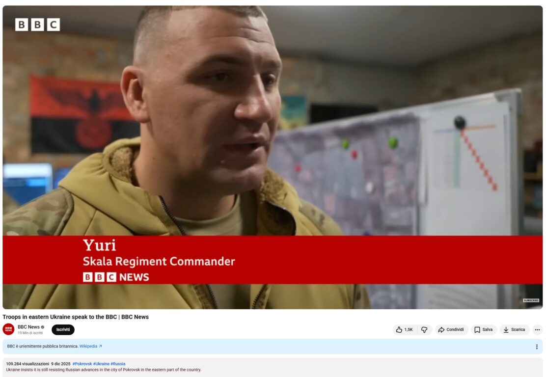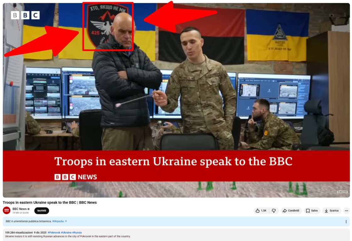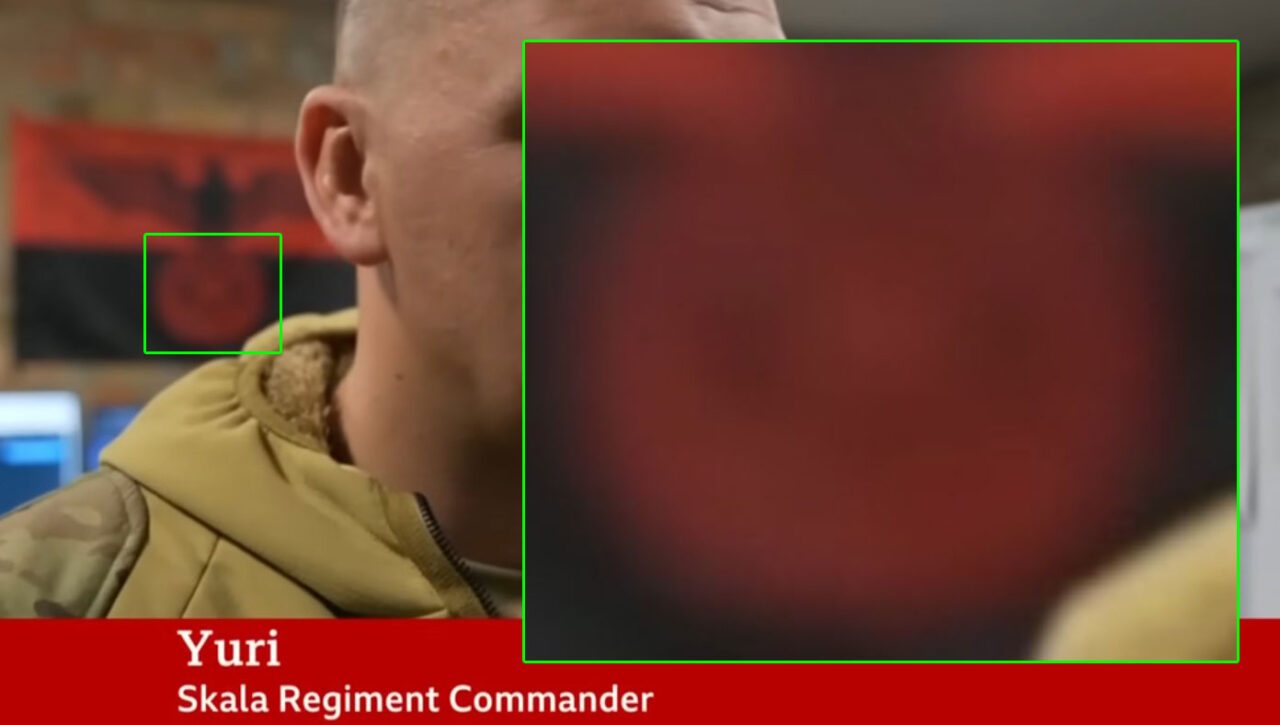 Le stesse riprese sono state trasmesse dalla BBC, intervistando un ufficiale del regimento Skala in Ucraina. Ecco il fotogramma dove viene mostrata la bandiera contestata:
