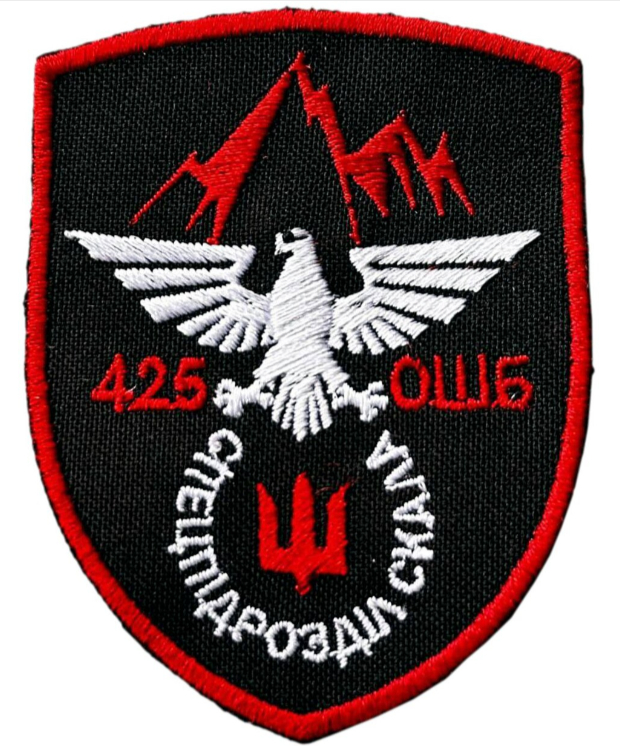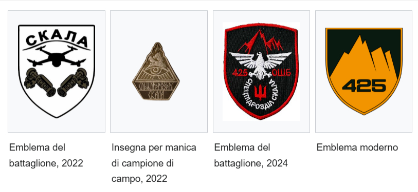 Il militare intervistato fa parte del 425th Separate Assault Regiment ‘Skala’. Il primo emblema del battaglione mostrava un drone con due Javelin, mentre nel 2024 venne utilizzato uno stemma raffigurante un’aquila d’argento su scudo nero, delle rocce nella parte superiore e il tridente stilizzato nella parte inferiore.