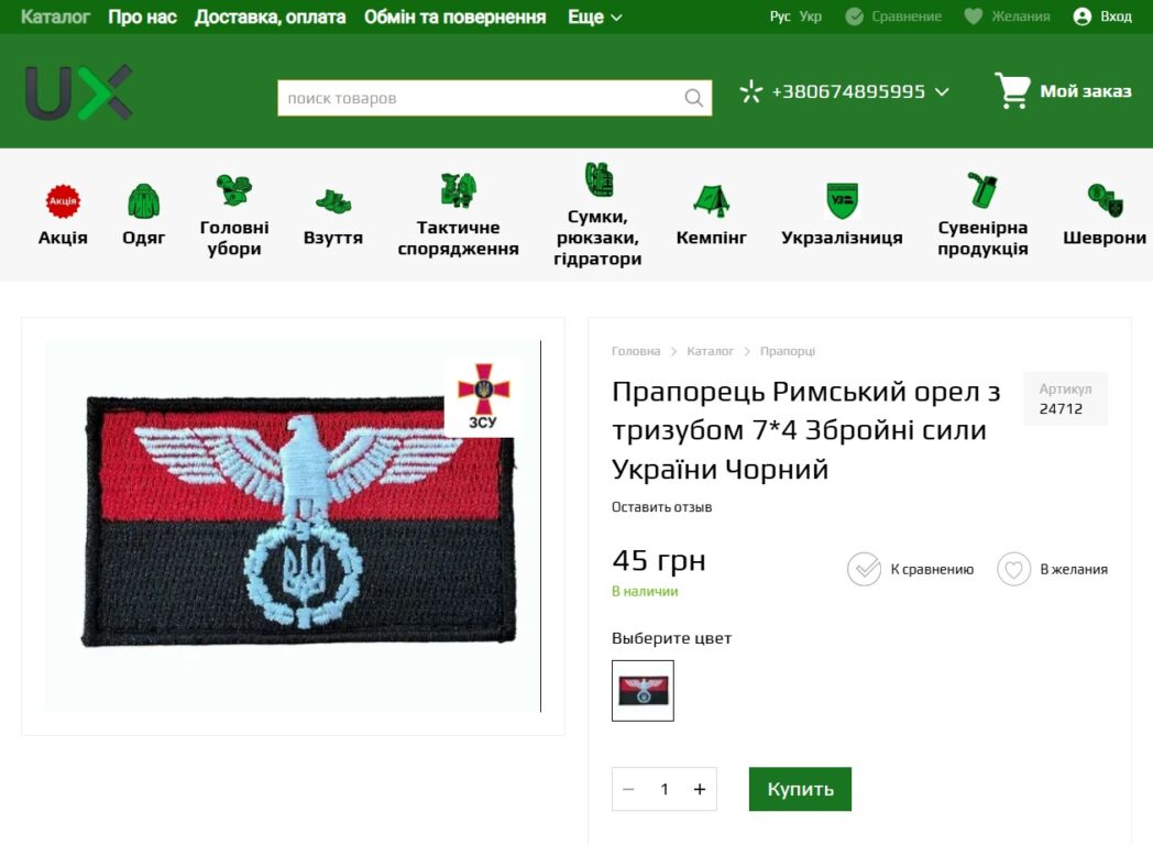L’emblema è presente nei gadget che si possono acquistare nei negozi online ucraini, dove troviamo la seguente descrizione: “Bandiera Aquila Romana con Tridente”. Un dettaglio non secondario riguarda i simboli nazisti, di fatto vietati per legge in Ucraina dal 2015 insieme ai simboli comunisti. Un’insegna apertamente riconducibile al Terzo Reich non potrebbe essere venduta liberamente.