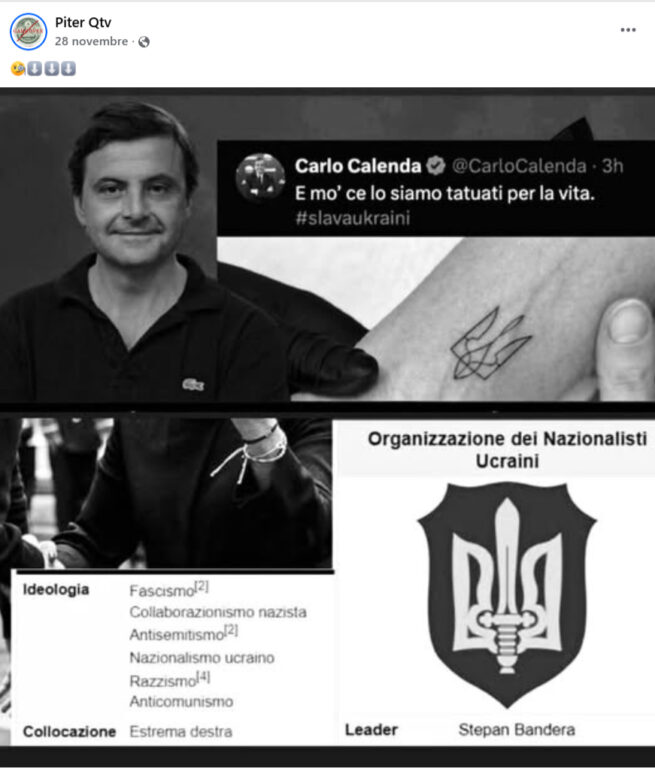 L’immagine viene diffusa mostrando Calenda con il tatuaggio e, sotto, uno screenshot che richiama l’OUN, etichettata come estrema destra. Il confronto suggerisce che il simbolo tatuato coincida con quello del gruppo, ma non sono nemmeno identici e, soprattutto, il tridente ucraino ha un’origine storica completamente diversa.