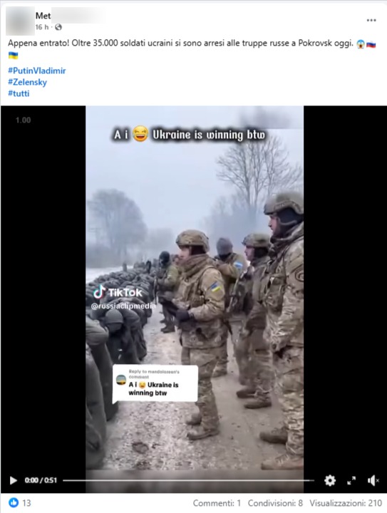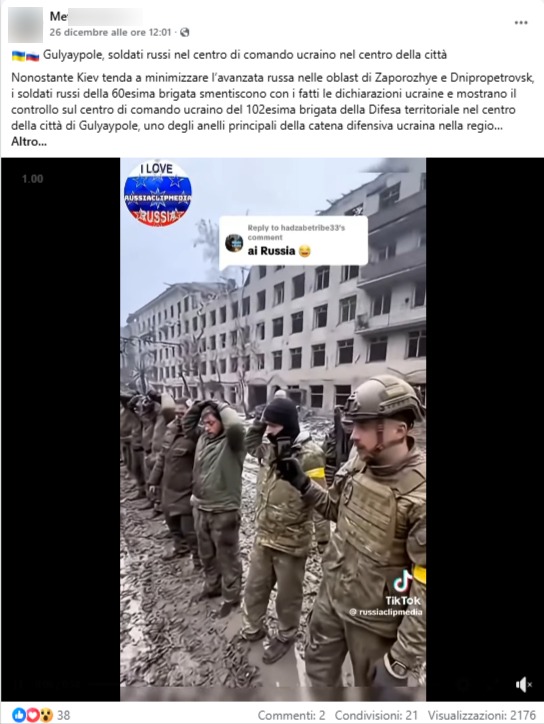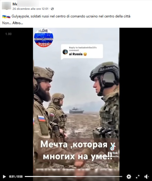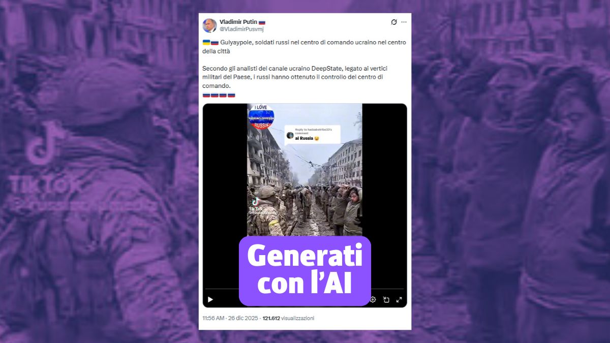 Tra il 26 e il 27 dicembre 2025, su X e Facebook, vengono condivisi post che mostrano un reel con presunti soldati ucraini catturati. Secondo la didascalia, le immagini mostrerebbero l’ingresso delle truppe russe nel centro di comando ucraino a Gulyaypole, nella regione di Zaporizhzhia. La clip, però, risulta generata con l’AI.