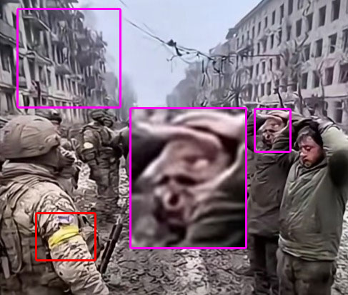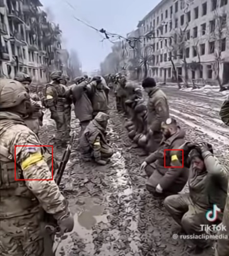 Nel primo filmato si sentono ordini in russo, dal mettere le mani sulla testa, inginocchiarsi, per poi camminare verso degli autobus. Tuttavia, osservando le immagini, tutti i soldati presenti indossano la fascia gialla, segno distintivo delle forze ucraine.