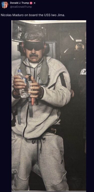 Donald Trump ha postato su Truth la foto di Nicola Maduro in manette. Il dittatore venezuelano è immortalato a bordo della nave militare americana Iwo Jima ammanettato, legato a un sedile e costretto a stare seduto con una bottiglietta d’acqua in mano. Maduro indossa un paio di occhiali oscuranti che gli avrebbero impedito quindi di vedere il percorso che lo ha portato a bordo della nave. I militari americani gli hanno anche coperto le orecchie con un paio di cuffie isolanti. Maduro indossa una tuta grigia dell’americana Nike. Non è chiaro però se quell’abbigliamento gli sia stato imposto o fosse già vestito così al momento della cattura nella sua camera da letto assieme alla moglie.