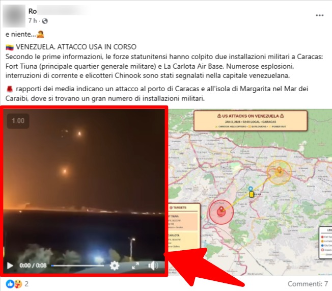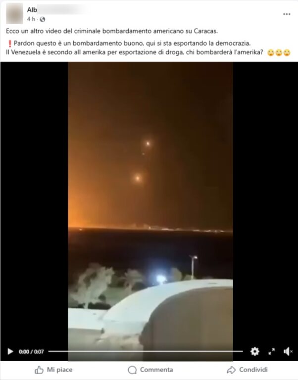 Il video viene rilanciato come presunta testimonianza diretta dei bombardamenti su Caracas. Le esplosioni notturne, i bagliori nel cielo e le riprese da lontano rafforzano l’impressione di un attacco in corso nella capitale venezuelana.