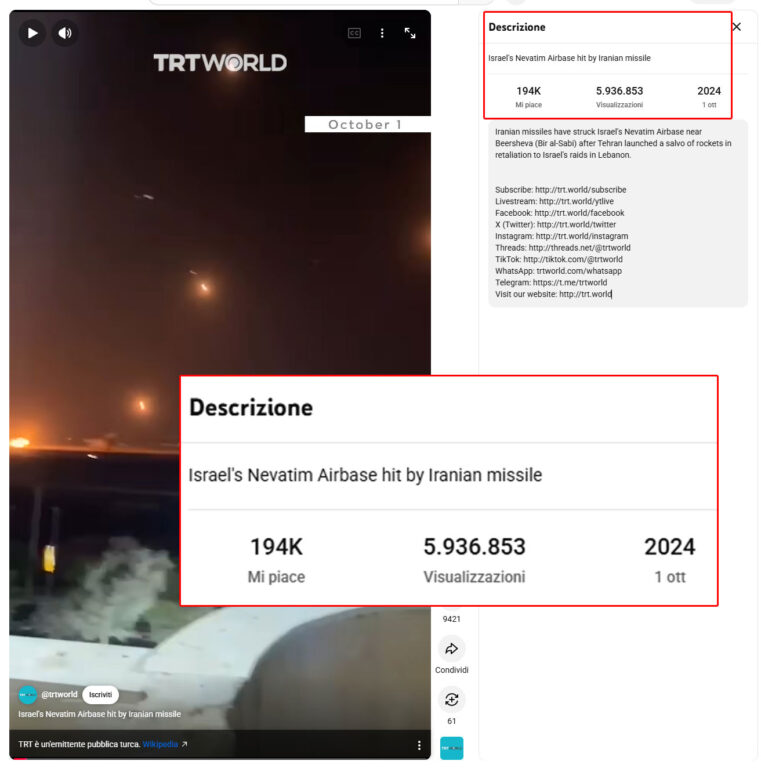La clip non è recente. Circola online almeno dall’ottobre 2024, diffusa in occasione degli attacchi missilistici iraniani contro obiettivi militari israeliani.