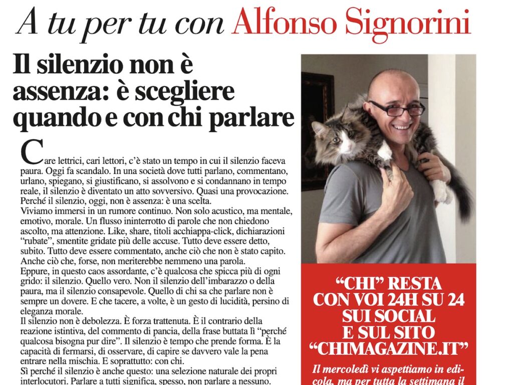 Dopo essersi autosospeso da Mediaset, dopo aver detto la sua versione dei fatti alla procura di Milano, in merito alle accuse di «violenza sessuale» ed «estorsione», contenute nella denuncia presentata dall’ex concorrente del Grande Fratello vip Antonio Medugno, Alfonso Signorini parla. E lo fa con un editoriale sul magazine da lui stesso diretto, Chi. «Care lettrici, cari lettori, c’è stato un tempo in cui il silenzio faceva paura. Oggi fa scandalo. In una società dove tutti parlano, commentano, urlano, spiegano, si giustificano, si assolvono e si condannano in tempo reale, il silenzio è diventato un atto sovversivo. Quasi una provocazione. Perché il silenzio, oggi, non è assenza: è una scelta».