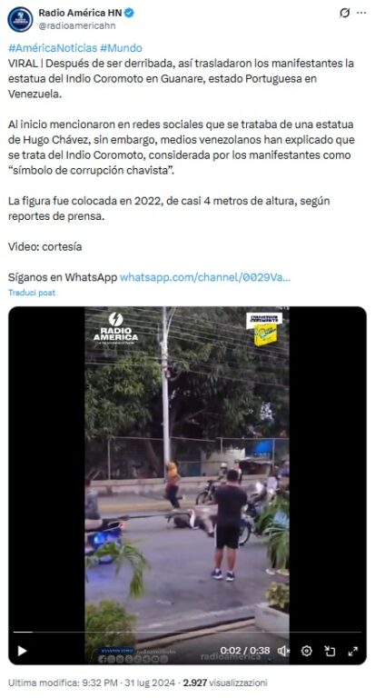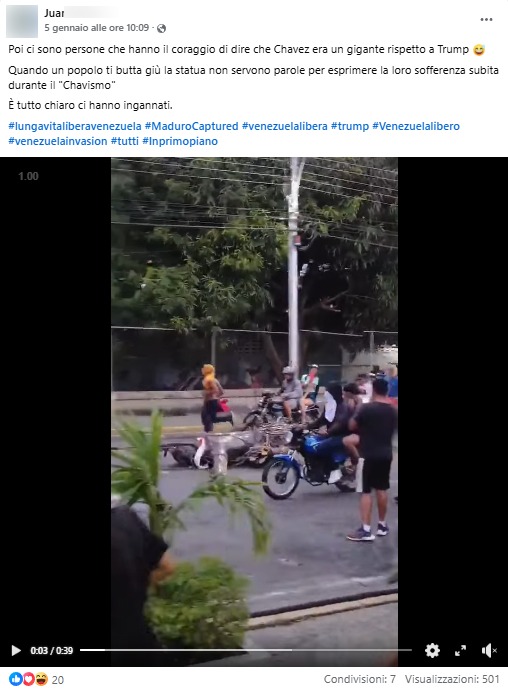 Tuttavia, il video in esame non riguarda una statua dell’ex leader venezuelano, ma quella dell’Indio Coromoto, una figura che viene intesa come rappresentazione della resistenza indigena contro il colonialismo e spesso citata dallo stesso Chávez.