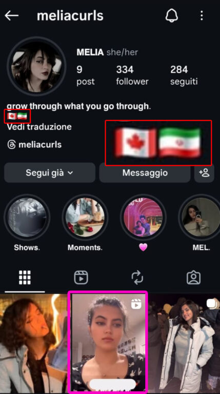 Sul suo profilo Instagram @meliacurls si firma invece come Melia. Nella bio compaiono due bandiere: quella canadese e quella iraniana.