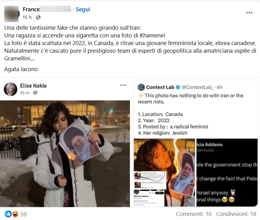 Una delle tantissime fake che stanno girando sull’Iran: Una ragazza si accende una sigaretta con una foto di Khamenei La foto è stata scattata nel 2022, in Canada, e ritrae una giovane femminista locale, ebrea canadese. Naturalmente c’è cascato pure il prestigioso team di esperti di geopolitica alla amatriciana ospite di Gramellini….