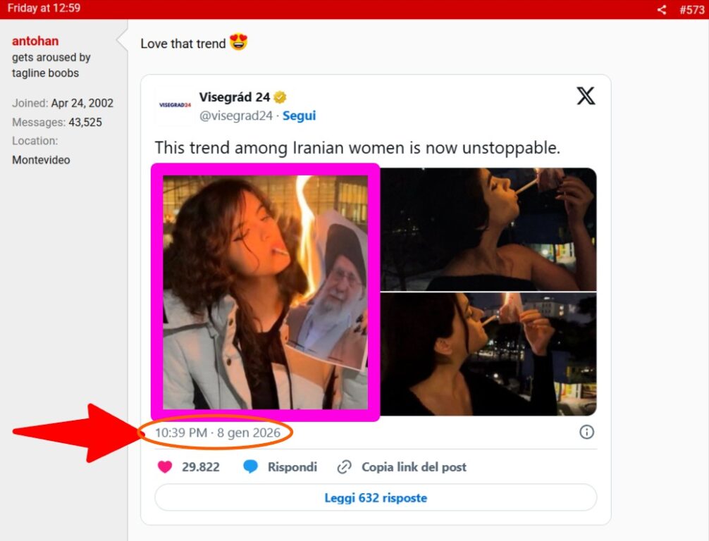 Nella ricerca Google viene fornita la data di apertura della discussione, mentre la foto risulta pubblicata proprio a pagina 15 nell’intervento #573 dove viene condiviso un post X di Visegrad24 dell’8 gennaio 2026. Google, di fatto, riconosce la presenza della foto attraverso quest’ultimo.