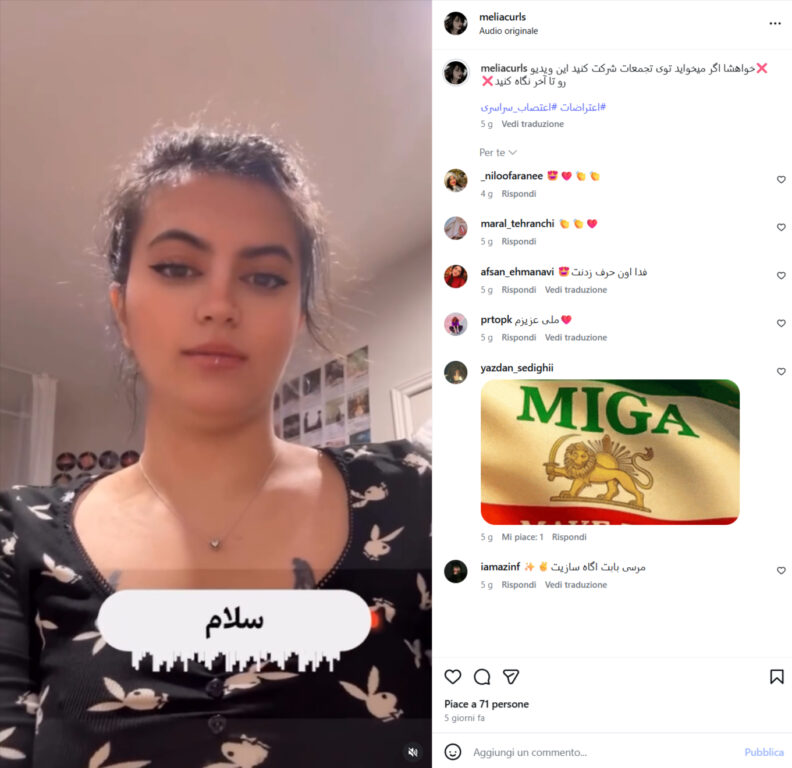 Sul profilo Instagram è presente un video in cui parla in lingua persiana (farsi), rivolgendosi direttamente a chi intende partecipare alle proteste contro il regime.