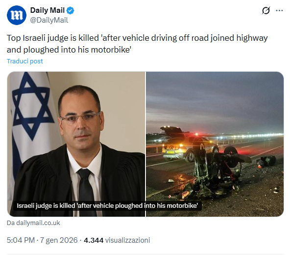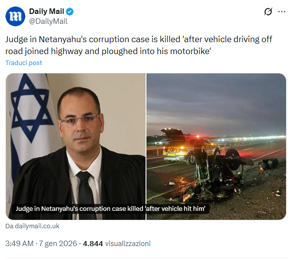A diffondere inizialmente questa versione è stato il tabloid britannico DailyMail, con un articolo intitolato “Judge in Netanyahu’s corruption case is killed ‘after vehicle hit him'”, condiviso su X il 7 gennaio 2026 alle 3:49 (ora italiana).