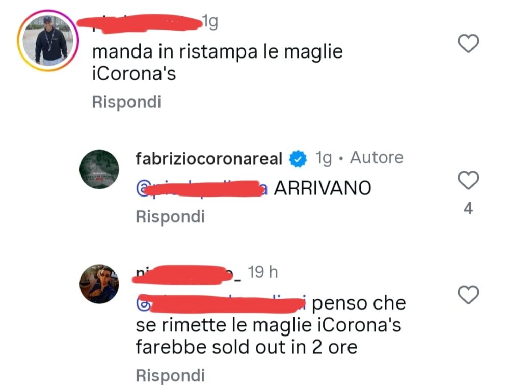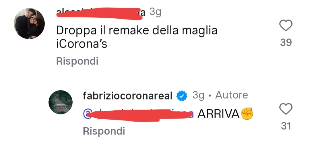 Un’altra reaction parecchio gettonata tra i follower di Fabrizio Corona su Instagram riguarda le t-shirt Corona’s, non un marchio ufficiale (come poi succederà, senza rimanere memorabile, con la linea Si Puede) indossate dal suo esercito di paparazzi sul campo e dallo stesso Corona durante una delle diverse uscite dal carcere. Ma soprattutto, si tratta della t-shirt che il protagonista della docufiction pare abbia proposto di indossare ad Azouz Marzouk, padre e marito delle vittime della famigerata strage di Erba. Un capitolo, forse esemplificativo della narrativa di Io sono notizia, in cui il vanto che Corona esprime per aver avuto l’idea di avvicinare e gestire, in qualche modo sfruttare, il clamore mediatico, seppur macabro, di un lutto che ha sconvolto e continua a far discutere l’Italia, viene bilanciato dalla condanna ferrea della madre di Corona (una delle tante distribuite nelle cinque puntate della serie a dir la verità). Una sorta di effetto agrodolce che effettivamente lascia ipnotizzati. Ecco, scorrendo i commenti sul profilo Instagram di Fabrizio Corona sono tantissimi quelli che chiedono a gran voce la ristampa delle magliette e lo stesso Corona ha risposto che presto torneranno sul mercato.