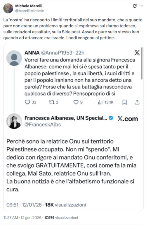 Dopo la repressione del regime iraniano, a far discutere non è una presa di posizione, ma una risposta netta data da Francesca Albanese su X. L’episodio risale all’11 gennaio, quando l’utente “Anna” (@AnnaP1953) chiama in causa Francesca Albanese, Relatrice speciale delle Nazioni Unite sui Territori Palestinesi occupati, chiedendole perché non si sia espressa sulla repressione in Iran. La replica, netta, arriva il giorno successivo: «Perchè sono la relatrice Onu sul territorio Palestinese occupato. Non mi “spendo”. Mi dedico con rigore al mandato Onu conferitomi, e che svolgo GRATUITAMENTE, così come fa la mia collega, Mai Sato, relatrice Onu sull’Iran. La buona notizia è che l’alfabetismo funzionale si cura». A contestarla pubblicamente è Michele Marelli, collaboratore di Limes e autore di diversi articoli proprio sull’Iran.