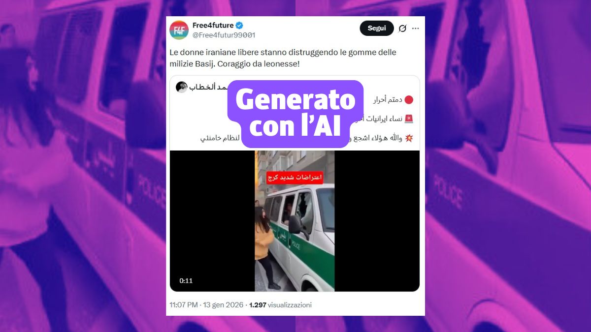 Circola un video dove diverse donne, armate di bastoni, colpiscono un mezzo della Polizia Morale iraniana. Le immagini vorrebbero mostrare la rivolta delle ragazze iraniane contro il regime, ma in questo caso si tratta di una scena generata dall’Intelligenza Artificiale.