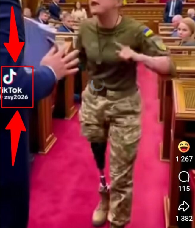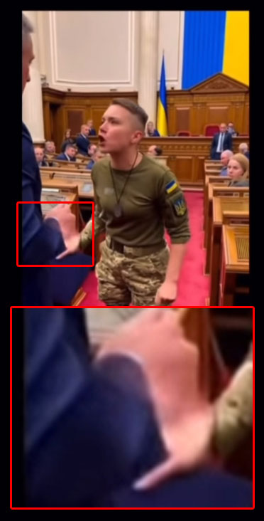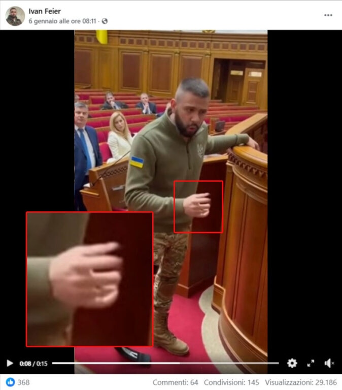 Un altro video, analizzato dai colleghi di Mythdetector, mostra un soldato che si sfoga davanti al posto riservato alle alte cariche del Parlamento ucraino. Improvvisamente, la mano dell’uomo si deforma del tutto.