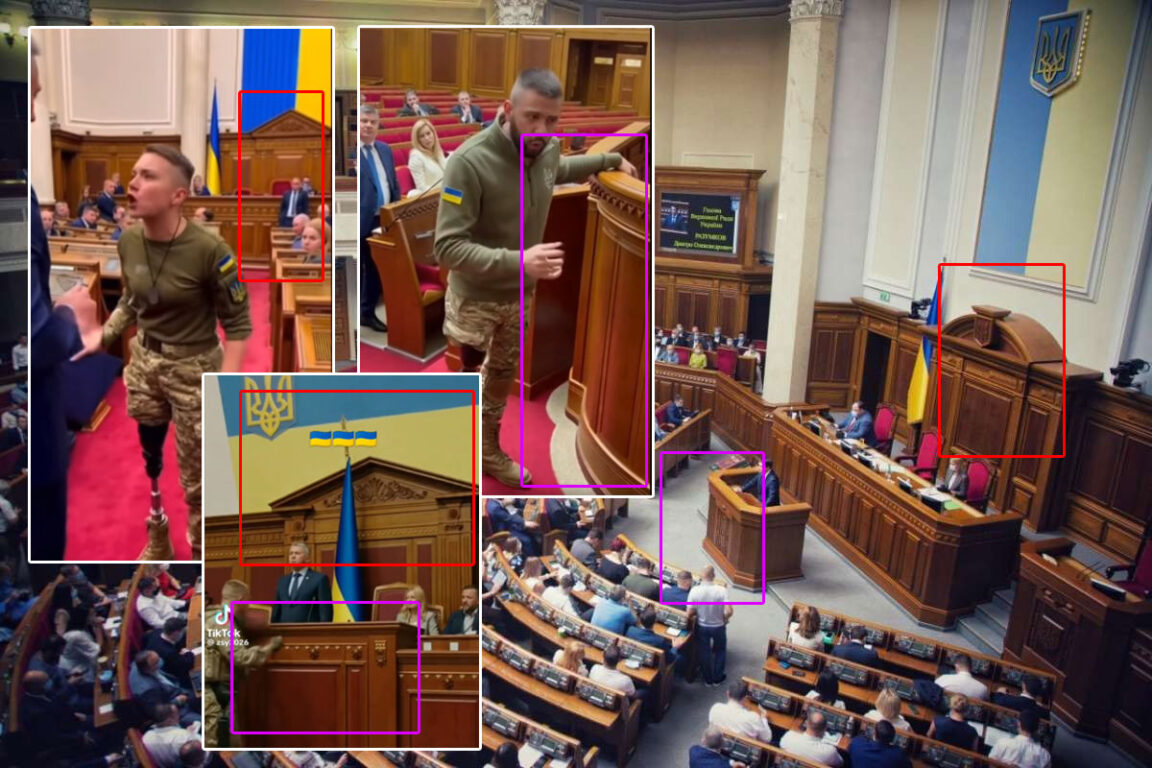 Dagli stessi video è possibile notare come le strutture non corrispondano affatto a quelle del Parlamento ucraino.