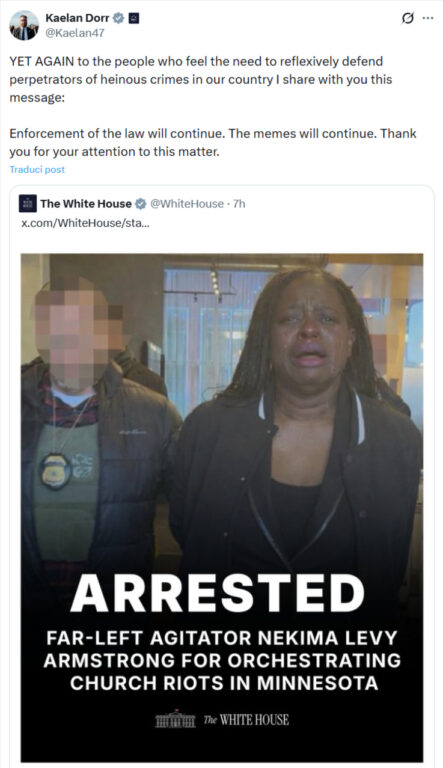 Un’operazione voluta, rivendicata dal vice direttore della comunicazione Kaelan Dorr su X: «Ancora una volta, a chi sente il bisogno di difendere automaticamente gli autori di crimini efferati nel nostro Paese, rivolgo questo messaggio: l’applicazione della legge continuera’. I meme continueranno. Grazie per l’attenzione su questo tema».