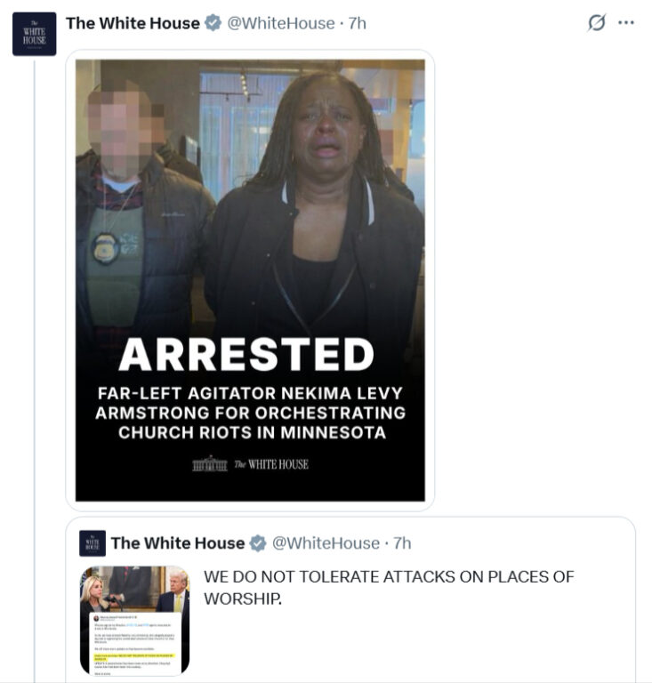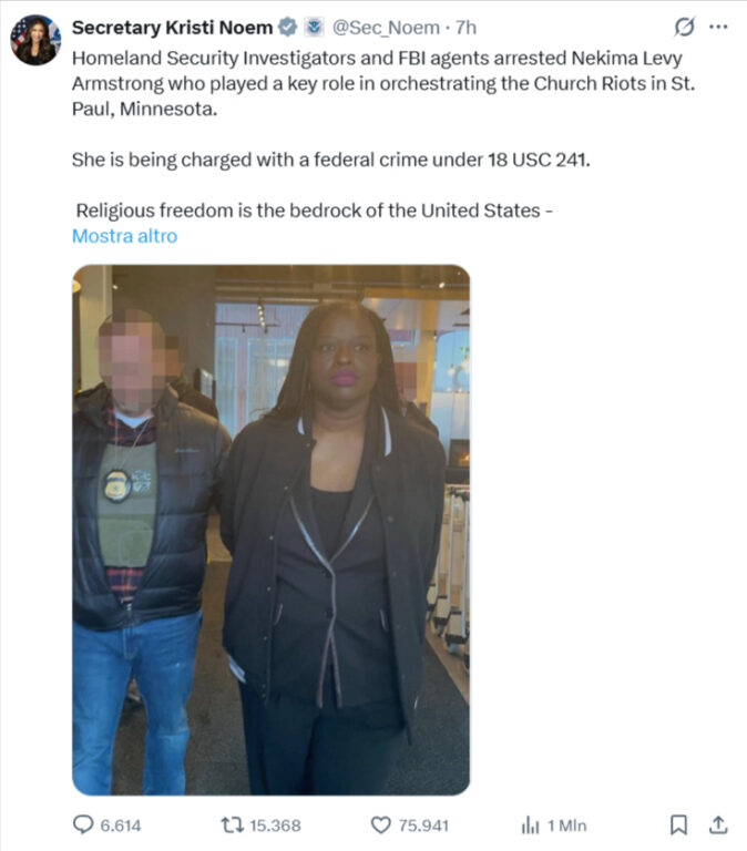 La Casa Bianca rilancia l’annuncio del procuratore generale Pam Bondi riguardo l’arresto di tre persone in relazione a una manifestazione che aveva interrotto una funzione religiosa a St Paul, in Minnesota. I manifestanti contestavano la presenza di uno dei pastori, David Easterwood, accusato di essere il responsabile operativo dell’ufficio locale dell’ICE, l’agenzia federale per l’immigrazione. L’immagine simbolo dell’arresto viene diffusa dalla segretaria alla Sicurezza interna Kristi Noem, mostrando il volto composto dell’attivista Nekima Levy Armstrong mentre viene portata via in manette.