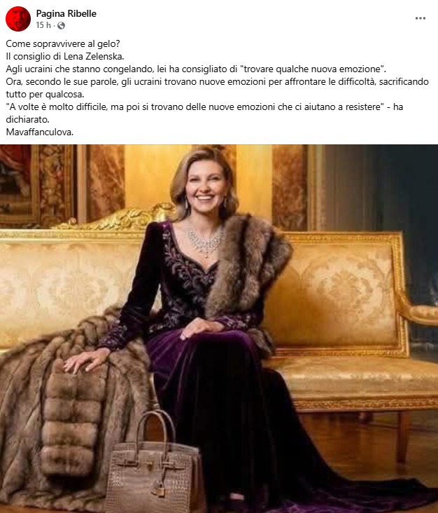 Mentre l’Ucraina affronta blackout, freddo e bombardamenti, sui social ha preso forma una narrazione che ritrae Olena Zelenska come una First Lady distante e privilegiata. A sostenerla, un’immagine alterata che la mostra circondata da oggetti di lusso e una frase che, secondo i post, inviterebbe gli ucraini che soffrono il gelo a “trovare nuove emozioni”. Una storia che non trova riscontro nei fatti e che utilizza una tecnica di disinformazione ben nota, già vista nella storia con Maria Antonietta e le brioche.