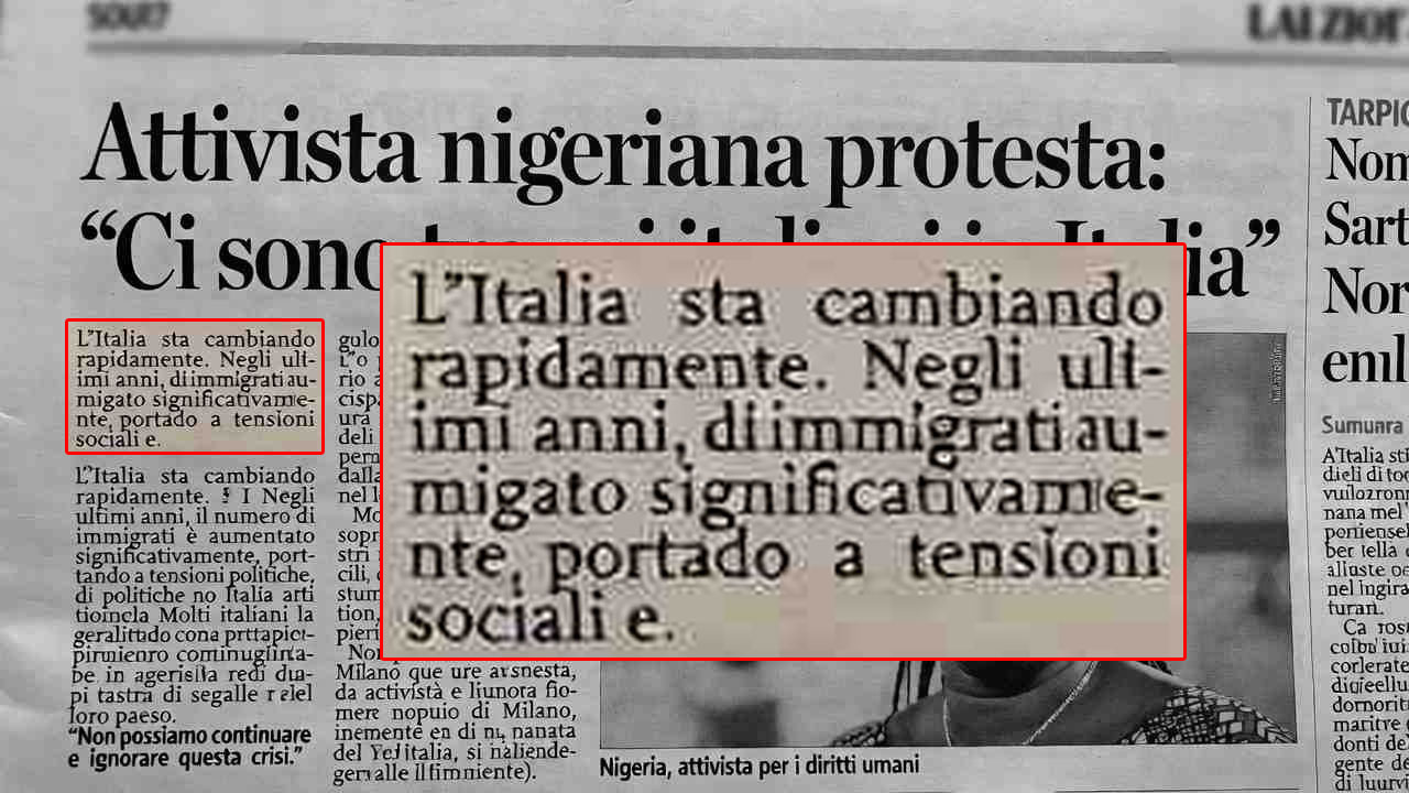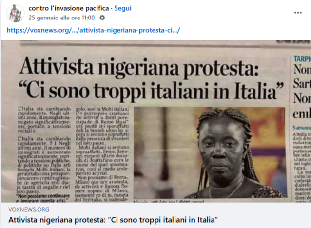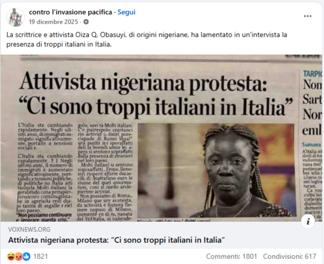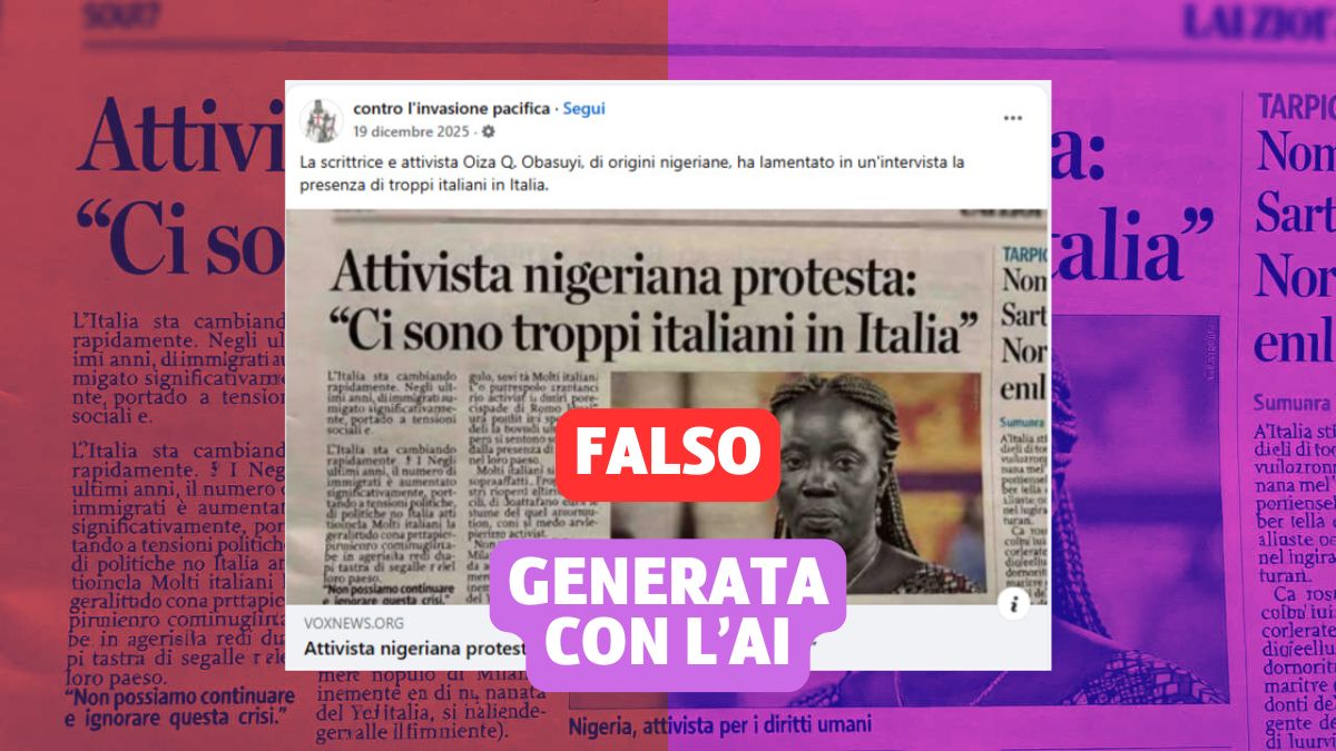 Circola l’immagine di un presunto articolo intitolato “Attivista nigeriana protesta: ‘ci sono troppi italiani in Italia’”. Nell’immagine compare la foto di una donna e una didascalia che attribuisce la frase alla scrittrice e attivista Oiza Q. Obasuyi. In realtà, quella nella foto non è affatto lei. Inoltre, parti del testo risultano prive di senso compiuto. Si tratta di un’immagine generata con l’Intelligenza Artificiale.