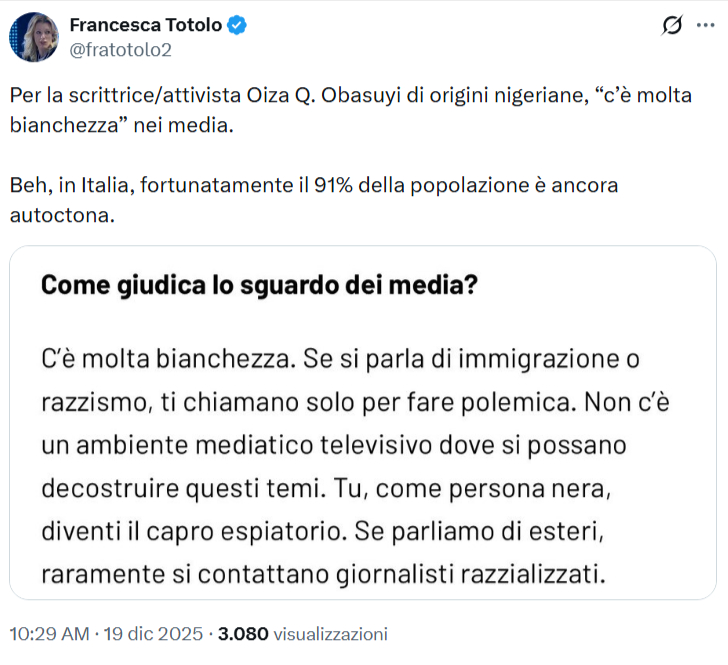 La scrittrice e attivista Oiza Q. Obasuyi, di origini nigeriane, ha lamentato in un’intervista la presenza di “troppa bianchezza” nei media italiani. Secondo lei ci sono troppi italiani in Italia e quando si parla di immigrazione o razzismo, le voci come la sua vengono chiamate solo per “fare polemica”, senza un vero spazio per “decostruire” questi temi. In un Paese dove i volti in TV e nei giornali sono come normale che sia prevalentemente italiani, Obasuyi vede un problema di rappresentazione: troppi italiani, troppo pochi “razzializzati”. Chissà quanti bianchi ci sono in Nigeria.