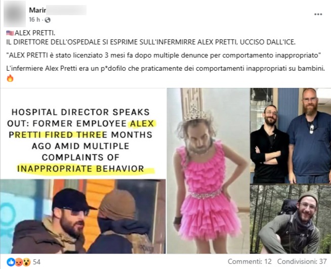 Nei giorni successivi all’uccisione di Alex Pretti da parte degli agenti dell’ICE a Minneapolis, sui social sono stati diffusi diversi contenuti falsi per elogiarlo o diffamarlo. In questo caso, analizziamo un post che punta a screditare la vittima con accuse gravissime e infondate, sostenendo che Pretti sarebbe stato licenziato tre mesi prima dell’omicidio e coinvolto in presunti casi di comportamenti sessuali inappropriati su minori. Insomma, la classica accusa infondata della pedofilia tipicamente usata sui social per distruggere la credibilità e l’integrità morale di una persona, in questo caso uccisa.